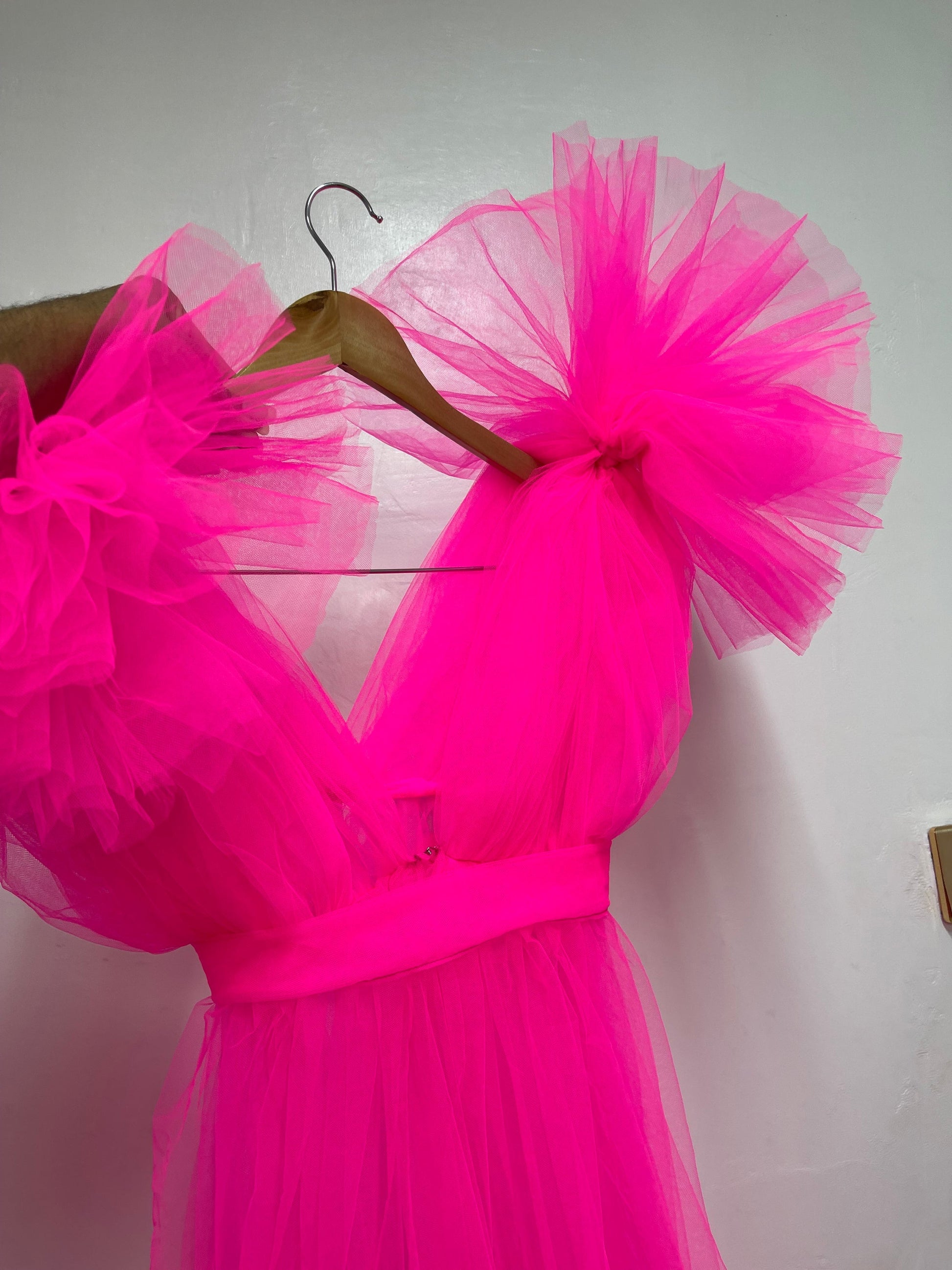 The poppy dress has a Deep V Neck open front, its main feature is its pom pom shoulder details.
